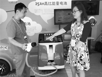 图四:这款电动汽车移动充电宝高一米左右,底部装有轱辘,可以随时移动着给任何一款汽车充电,所用电池为二次利用,就是将从退役大巴上拆下的电池进行重组后继续使用。