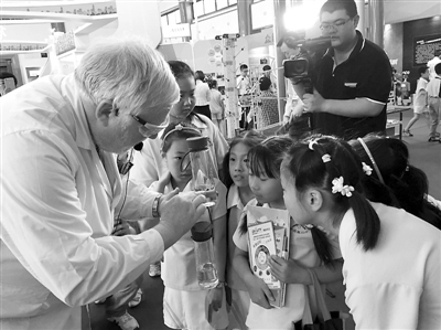 图三:戴维·埃文斯是英国皇家化学学会北京分会的会长,他拿着个装有一半液体的杯子晃了晃,液体颜色瞬间的交替变化就引来一堆小脑袋的好奇。戴维说,要让孩子们爱科学不能上来就讲道理,想办法让他们产生好奇才最重要。