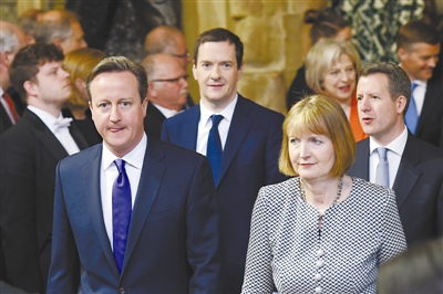 当地时间5月27日,英国伦敦议会大厦,英国首相卡梅伦(前左)和工党执行领袖哈里特·哈曼(前右)出席英国女王演讲。东方IC供图