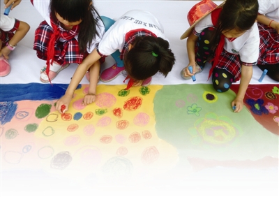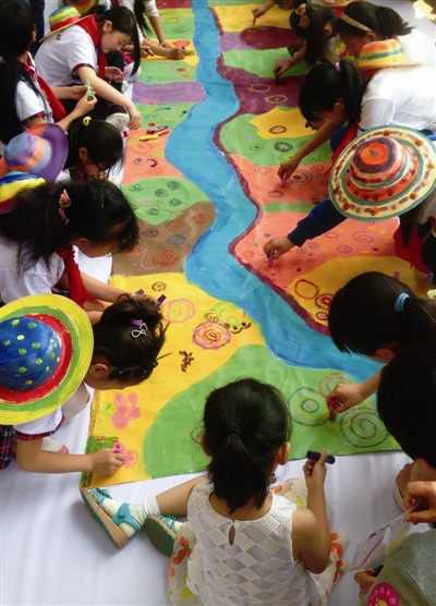 在现场活动中,一百余名打工子弟学校的学生受邀来到中国美术馆,首先参与了“童绘美丽家园”的集体创作。孩子们充分发挥想象,把自己对国家的爱、对故乡和新家的爱和憧憬,用绘画的方式展现在长卷上。这幅凝结了孩子们对美丽家园憧憬的集体作品,像一道绚丽的彩虹装点着美术馆优雅的长廊。集体创作活动在欢乐的氛围中结束。