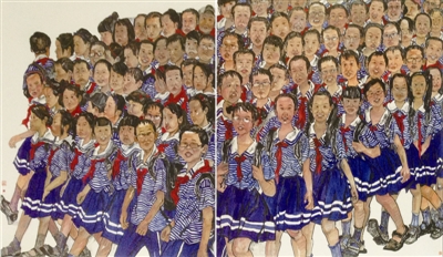 曾在全国美展中获奖的雕塑作品《1949——新中国少先队员》将建国后少先队初建时的美好回忆瞬间定格,用雕塑语言立体真实的呈现在读者面前,创作者陈妍音以朴实无华的写实手法,浪漫、写真地处理了各种人物的不同且有特色的衣着、姿势和表情,创作手法虽属现实主义风格,但由于其写实刻画功底深厚,抓住由表及里的人物内心世界,表情和人物比例不失浪漫色彩的艺术化处理,使人物个性生动,辅以写实的雕塑语言浸润期间,再由里及表、整体呈现出怀念走过青春的创作主旨,尽显艺术语言的准确与雕塑立体感的坚实。同样的题材范畴,另一获奖的国画作品《北实小·下午五点十分》,则是以特定时间和地点切入,用非常朴实的创作题目,却不避中国画最忌!采用了造险破险的当代构成画面,既胀满画面,又破出画面,全然是童心无忌的肆意构图;虽画中人物众多却表情各异,校服统一,却又高矮胖瘦,穿出各自特色。色彩简单但又不单调。作者完全颠覆了主题创作的戒律,却使作品清新脱俗,倍显张力。回望年少,当有此挥洒无忌,自由表述的创新和主动突破;这也是此作获得认可、好评,夺奖成为必然。