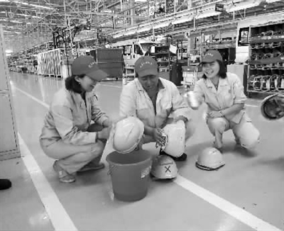 东风汽车股份轻型商用车分公司四总装车间党支部组织党员、入党积极分子利用休息时间,为繁忙的生产一线员工清洗安全帽,让员工工作时有个好心情。