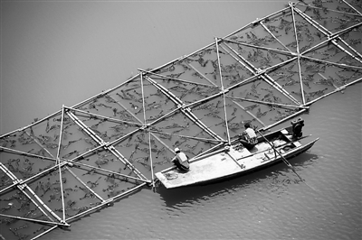 5月31日,在长江支流湖北宜昌兰陵溪水域,工作人员在对人工鱼巢进行日常检查维护。