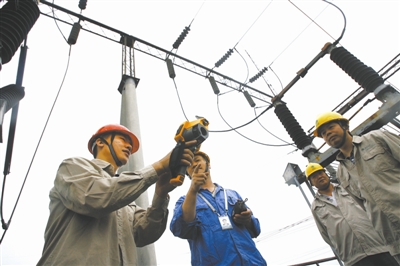 图为全国劳模、江苏海门供电公司的丁雪峰(左一)和同事一起攻坚克难。本报记者 杨登峰 摄