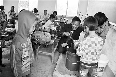 谢毕华是贵州省威宁彝族回族苗族自治县斗古乡关口小学洼营教学点的一名教师。洼营教学点地处乌蒙大山深处,在2009年该教学点建立之初,本来在条件稍好的关口小学任教的谢毕华主动申请调到这里任教。六年来,谢毕华孤身一人守着20余名学生,使原本要走两个多小时山路去上学的学生,实现了“家门口”上学的梦想。图为5月28日,谢毕华在给学生分发“营养餐”。
