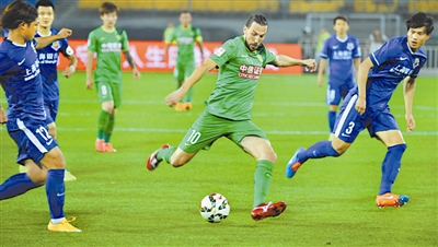 6月1日晚,在中超联赛第12轮的一场比赛中,北京国安主场2比1击败上海申鑫。图为国安外援德扬在比赛中射门。本报记者 许之丰 摄