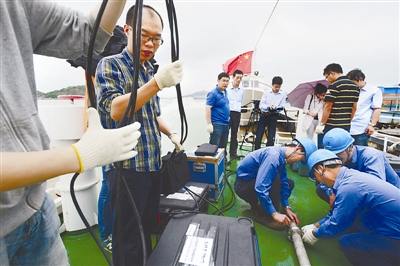 6月3日上午,在舟山市十六门附近海域,电力工人正在安装目前国内第一套用于海缆施工的海底地貌综合探测设备,进行首次海中实测试验。