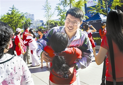6月7日,2015年高考拉开帷幕,942万名考生奔赴考场。这是在北京人大附中考点,一名教师为其学生加油打气。 本报记者 王伟伟 摄