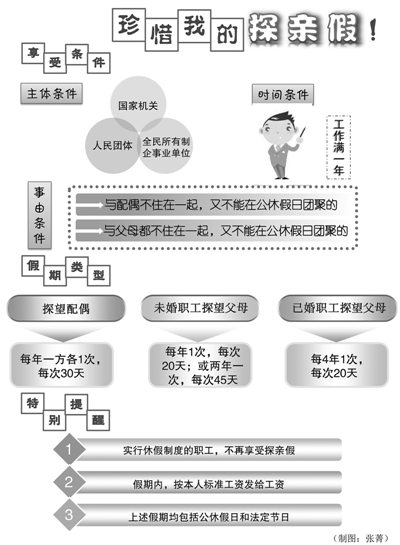 本报讯 (记者张菁)“回家看看爸妈”,是多少在外漂泊职工心中的期盼。然而探亲假,一个存在了34年的休假制度,有的符合条件的职工可能还没有享受过,处于“不知道、不愿请、不敢请”的尴尬境地。探亲假,是指职工享有保留工作岗位和工资而同分居两地、又不能在公休日团聚的配偶或父母团聚的假期。1981年出台的《国务院关于职工探亲待遇的规定》,对探亲假的执行办法做了详细说明。哪些人可以休?如何休?下图帮您解答。
