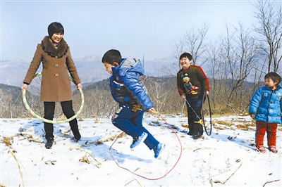乡村老师孟敏和她仅有的3个学生在雪地上进行课外活动(2014年2月20日摄)。山东济南章丘市垛庄镇四角城村有300多口人,孟敏是四角城教学点唯一的老师,30年来,孟敏一直坚持做着一件了不起的事儿:教村里的孩子识字算数。她教过的学生已有300多人,已经快要超过村里目前的人口总数。孟敏说,即使只有一个孩子,她也要坚持教下去,但她更希望孩子们能有更好的学习环境。 新华社记者 郭绪雷 摄