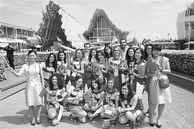 6月8日,在意大利米兰世博会世博园中国馆外,志愿者们手持中意两国国旗合影。