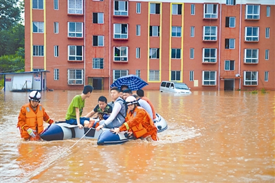 6月10日,在贵州省遵义市余庆县白泥镇,消防官兵将被困群众转移到安全地带。