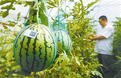目前正值河北省新乐市田雨农场西瓜上市季节,工作人员给每一个即将成熟的西瓜都贴上了二维码,消费者购买时用手机扫描二维码,就可获知西瓜的产地、品种、生产标准等。新华社记者 王晓 摄