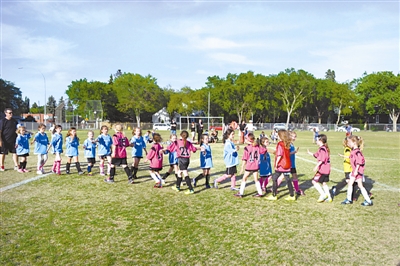 作为加拿大日照最充足的城市之一,典型的北方大陆性气候令埃德蒙顿的夏季总是不缺少阳光。时近傍晚7点,位于埃德蒙顿西北区格莱诺拉社区学校的足球场上依然是一片欢声笑语——来自这个学校的两支小女足队伍正在进行“紧张”的对抗赛。一次“激烈”拼抢后,身穿23号球衣的金发小姑娘不慎倒地,委屈的哭声让刚刚还在认真指挥比赛的教练不得不暂停比赛,和场边的家长一起跑过去,赶紧“治疗”这位伤心的小队员……