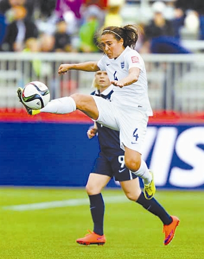当地时间6月9日,在本届女足世界杯赛小组赛中,法国队以1比0战胜英格兰队。图为英格兰队的威廉姆斯(前)在比赛中断球。新华社 邹峥 摄