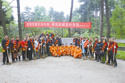 2013年4月,贵阳市总工会领导班子与全市劳模一起栽种“劳模示范林”,为加快全国生态文明示范城市建设贡献力量