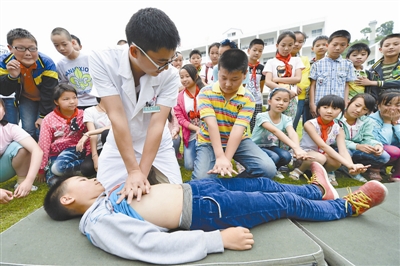 6月9日,湖北保康县歇马镇小学学生在医务人员的指导下学习对溺水同伴的施救方法。镇中心卫生院医务人员向孩子们教授如何救助溺水者以及自救自护常识,以提高孩子们的安全意识和自救互助能力,让每个孩子安全度夏。