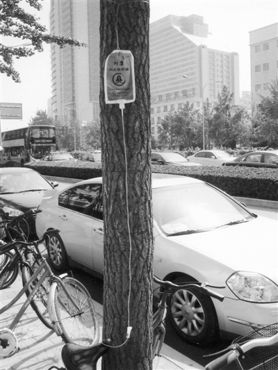 看到这棵大树上挂着的输液袋,千万别以为是谁在开玩笑,把输液袋挂错了地方。原来,这棵位于北京中关村南大街的银杏树,近日被诊断得了枯叶病,于是,海淀区园林局的园艺师就采用输送营养液的方法让它恢复健康。