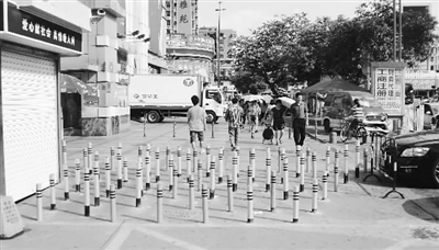 2015年6月11日,广东深圳市,宝安区一处路面设置了70多条路桩,以防止乱停车。CFP供图