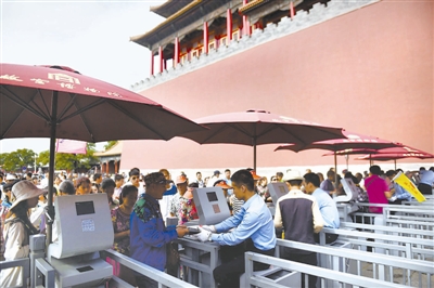 6月13日,游客检票准备进入故宫参观。