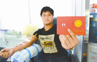 6月14日,一名参加无偿献血的河北保定市民在展示他的无偿献血证。