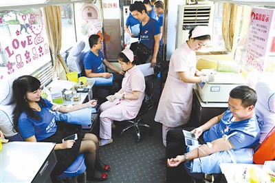 6月14日,河北一家企业的员工在河北血液中心流动捐血车上义务献血。