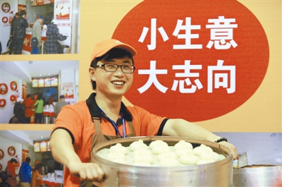 6月13日,为期三天,主题为“创业与责任”的2015第22届全国特许连锁加盟创业项目博览会在沈阳科学宫会展中心开幕。展览会吸引来自全国各地餐饮、糖酒、食品、教育等行业的300余家连锁企业的1000个品牌项目参展。图为一位工作人员在“创业博览会”上现场展示刚出炉的包子。