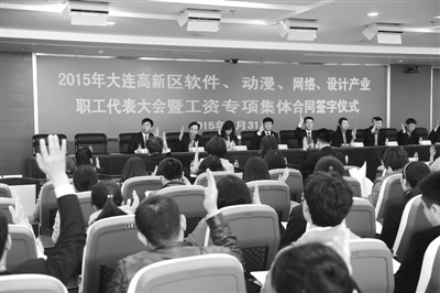 大连高新区主导产业为软件和服务外包、网络、动漫游戏、设计等,区内非公有制企业多、民营企业多、跨国企业多,在全区16万余职工中,“高学历、高素质、高技能”的“三高白领”职工占大多数,探索行业性、区域性工资协商是高新区工会的重要课题。软件产业工会主席徐世辉告诉记者,高新区软件行业开展工资集体协商工作难度很大,包含的工种门类很多,收入分配方式和分配标准也很复杂,没有现成标准和既成经验可借鉴。在这种情况下推进这项工作,对于以软件产业为支柱产业的高新区规范行业用工制度、统一行业用工标准、推动行业有序竞争和健康发展有着积极意义。2012年4月,大连高新区工会完成全国软件行业首例工资集体合同签订,之后,不断巩固和扩大集体协商工作成果。至2015年3月,高新区工会已相继推进了软件、动漫、网络、设计产业工资集体协商工作,覆盖1000多家企业、9万余名员工。4个产业在26个通用职业岗位最低工资标准、年度职工平均工资增长率等方面有了新的保障线,其中上浮最高的最低工资标准较大连市政府规定的同期最低工资标准上浮达177%。