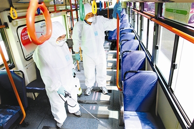 6月15日,韩国首尔市城东区工作人员对该区公共交通工具进行消毒。