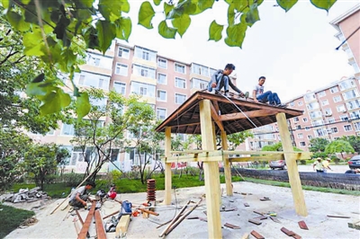 6月17日,在长春市二道区荣光街道十三局宿舍小区,工人们在搭建休闲凉亭。日前,长春市“老旧散”小区改造工作正稳步推进,预计10月底前陆续完工,届时将有30个“老旧散”小区完成“美丽蜕变”。新华社记者 张楠 摄