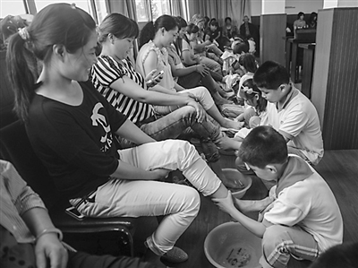 6月16日,浙江省长兴县第五小学四年级二班的孩子们在“孝爱课堂”上给父母洗脚。