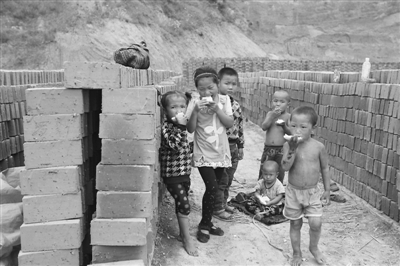6月7日,陕西蓝田县砖厂里的彝族孩子们一起在砖厂玩耍,彼此间很团结,学会了分享。