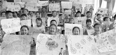 近日,重庆市永川区红旗小学通过黑板报、手抄报、绘画等形式,开展环保主题教育活动,进一步增强师生们的环保意识,教育学生以实际行动向污染宣战,激发广大师生参与环境保护的主动性和积极性。图为四年级的学生在展示自己画的环保画。陈仕川 摄