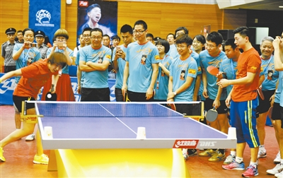 6月18日下午,北京科技大学乒乓球馆星光熠熠,在苏州世乒赛上拿到单打冠军的马龙和丁宁与百余位来自全国各地的球迷进行了近距离互动。本报记者 许之丰 摄
