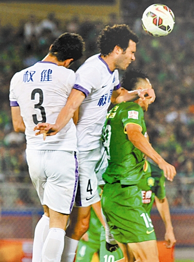 6月20日晚,在中超联赛第14轮比赛中,北京国安主场3比0击败天津泰达。图为双方队员在比赛中争抢头球。