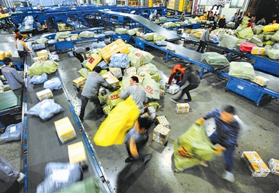 圆通快递公司杭州分公司的员工在分拣快递(摄于2012年11月11日)。