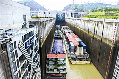 6月22日,船舶通过三峡双线五级船闸上行。当日,从长江三峡通航管理局获悉,三峡船闸和葛洲坝船闸5月通过货运量双双破千万吨,与4月相比均有所增加。今年1至5月通过货运量与去年同期相比,均呈增长趋势。 新华社发(郑家裕 摄)