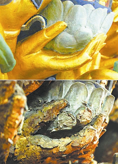 然而,在詹长法详细的讲解中,记者发现,像X光探伤这样的技术仅仅是“体检”中的一部分,也是千手观音修复工程科技运用中的冰山一角。经了解,在整个修复过程中,像红外热像探测、激光拉曼测样、三维视频显微镜观察等方法都是首次应用于大型不可移动石质文物勘察研究中。同时还进行了工艺修复试验,并启动了千手观音修复效果及本体稳定性跟踪监测工作。整个修复工程涉及造像石质、彩绘、金箔三种材质的34种复合病害,展开面积约220平方米。
