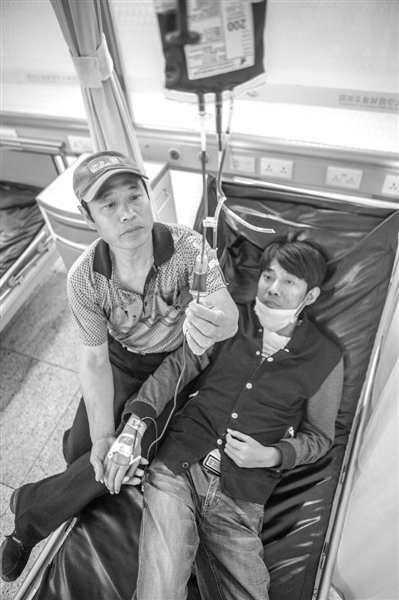王宇心疼父亲,总是默默忍受,慢慢延长输血的周期,等到要输血的日子时,他连下楼都需要王纯平背着。身高不足一米七的王纯平背着近一米八的儿子走下6楼有些气喘,却总对儿子说:“爸爸不累!没事。”看着儿子输上了血,王纯平终于可以踏实地坐会儿,他总是静静握着儿子的手默默地陪伴。