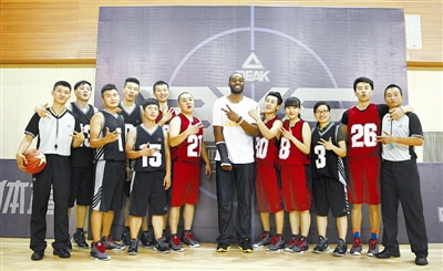6月23日,“十年如一——2015匹克球星中国行暨三对三篮球赛启动仪式”在京举行。NBA球星托尼·帕克、卡尔·兰德里出席仪式,并现场揭晓了新款战靴帕克三代以及速鹰三代,同时开启了匹克三对三冠军赛的大幕。图为兰德里和球员合影。刘君 摄