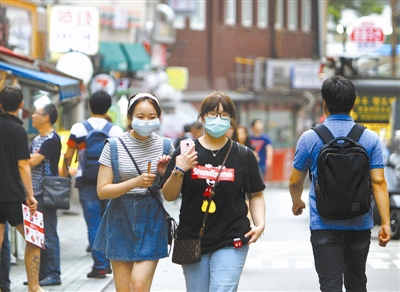 6月24日,外国游客在韩国首尔明洞商业区游览。