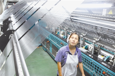 6月26日,莆田华峰集团员工谭双利查看制造鞋服面料的高智能挡车机台。