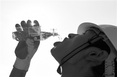 6月29日,在广西南宁市良庆大桥(五象大道)立交工程建设工地上,一名工人在喝水解渴。