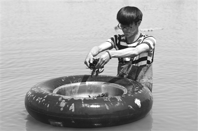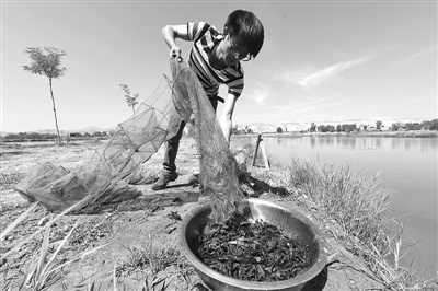 在永登县龙泉寺镇小龙虾养殖基地,魏学恒收集网兜中捕捉的小龙虾。