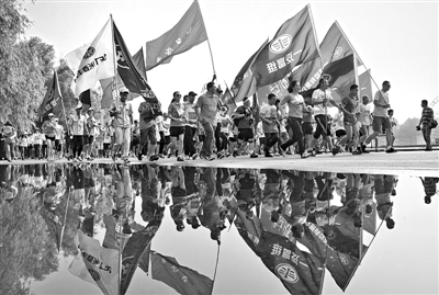 图为启动仪式后,一汽集团21个子公司的630名职工参加健步走比赛。