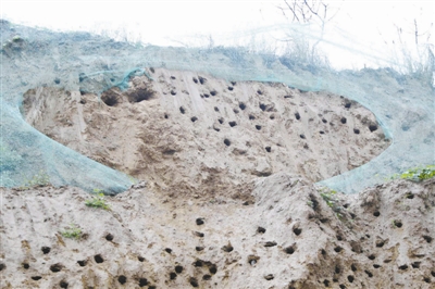 6月29日,郑州西流湖西岸一工地,新挖的基坑高壁上,今春有数千只灰沙燕在此做窝。为了保护这些灰沙燕,施工方不仅盖防尘网时专门留下这一块,且推迟打水泥护墙。