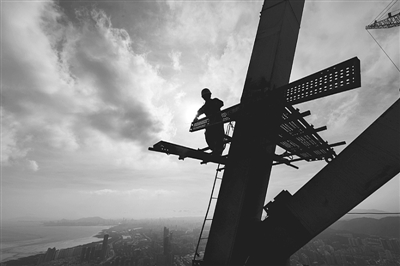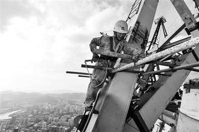 当日,在中国建筑工程总公司所属中建一局总承包的华南第一高楼——深圳平安金融中心工地,建筑工人冒着超过35摄氏度的高温,在近600米的高空进行顶部钢结构的焊接工作。 新华社记者 毛思倩 摄