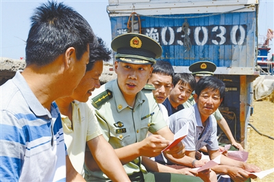 7月1日,唐山市南堡边防派出所民警在向“嘴东流动党支部”的流动党员介绍惠民新政策。当日,河北省唐山市南堡公安边防派出所民警利用休渔期,组织长期在海上捕捞作业的流动党员,在辖区嘴东渔港码头开展“忆党史、感党恩、惠民情”主题党日活动,重温入党誓词,学习党中央惠民新政策。据了解,南堡公安边防派出所党支部于2007年申请成立了“嘴东流动党支部”。新华社记者 杨世尧 摄