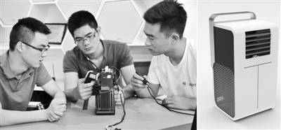 江苏常州大学学生颜岩和他的创业团队成功研发了一款“迷你空调”。这款产品高18厘米、宽15厘米,重0.7公斤,可以产生低于环境温度10摄氏度的冷风,具有体积小、重量轻等特点。图为颜岩(左)和他团队的队员在对“迷你空调”样机进行优化讨论。胡平 摄 (新华社发)