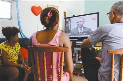 7月1日,在古巴哈瓦那,市民在家中观看美古重建外交关系的电视新闻。新华社发